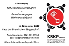 4. Jahrestagung der KSKP. Am 6. Dezember 2012 veranstaltet die Kooperationsstelle Kriminalprävention im Haus der Bremischen Bürgerschaft die 4. Jahrestagung zum Thema "Sicherheitspartnerschaften - gemeinsam gegen Wohnungseinbruch".