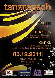 Musik: DJ Markus; Specials: Breakdance, Floordance, Aktionstheater, Wilde Bühne; Drinks: Coole Cocktails ohne Alkohol gemixt von Sandcafé der OS In den Sandwehen. Eintritt: 1,- Euro.